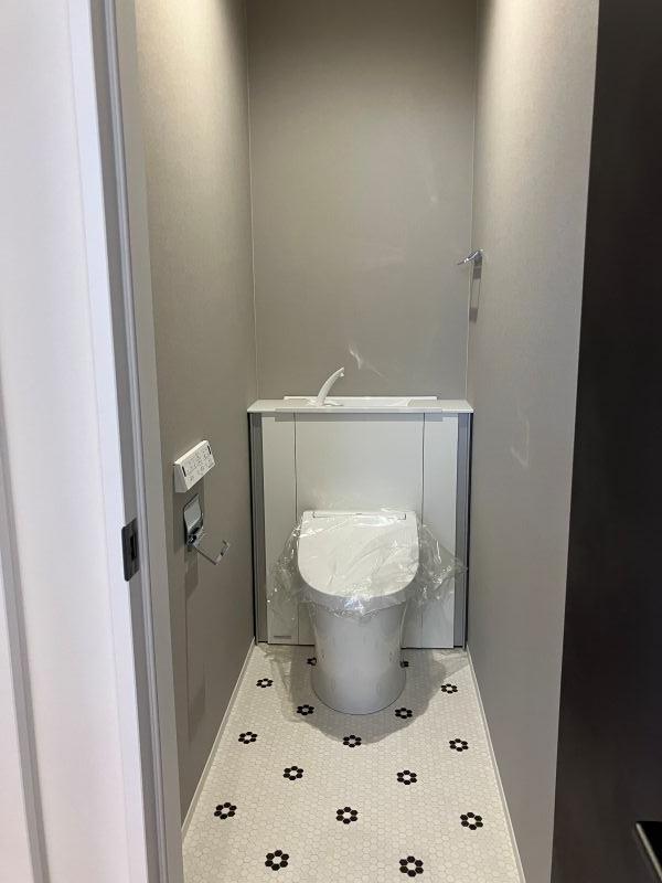 2階のトイレは薄いグレーのクロス、白のトイレと何気ない組み合わせですが、タイル調の花柄クッションフロアとヴィンティアの黒のドアが利いていて、絶妙な組み合わせです(^^♪