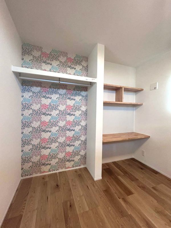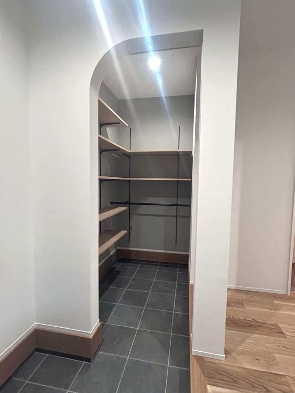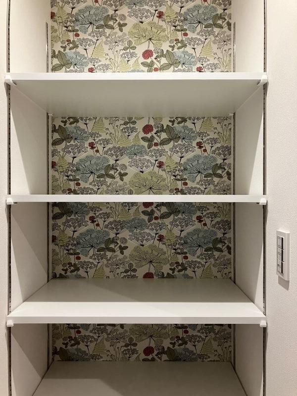 キッチン横のパントリーの見えない部分に、こっそり奥様お気に入りのクロスを貼っています。(クロス好きにはわかるこの気持ち・・・)