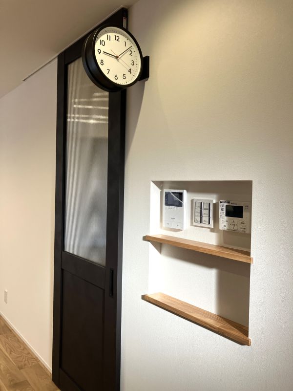 リビングのメインドアはヴィンティアの黒のハイドアでガラスのデザインや時計・ニッチ等がポイントになっています。