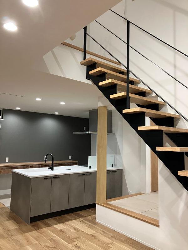 LDK:オープンキッチンやリビングの吹抜けの鉄骨階段、小上がりの和室等変化のある空間になっています!