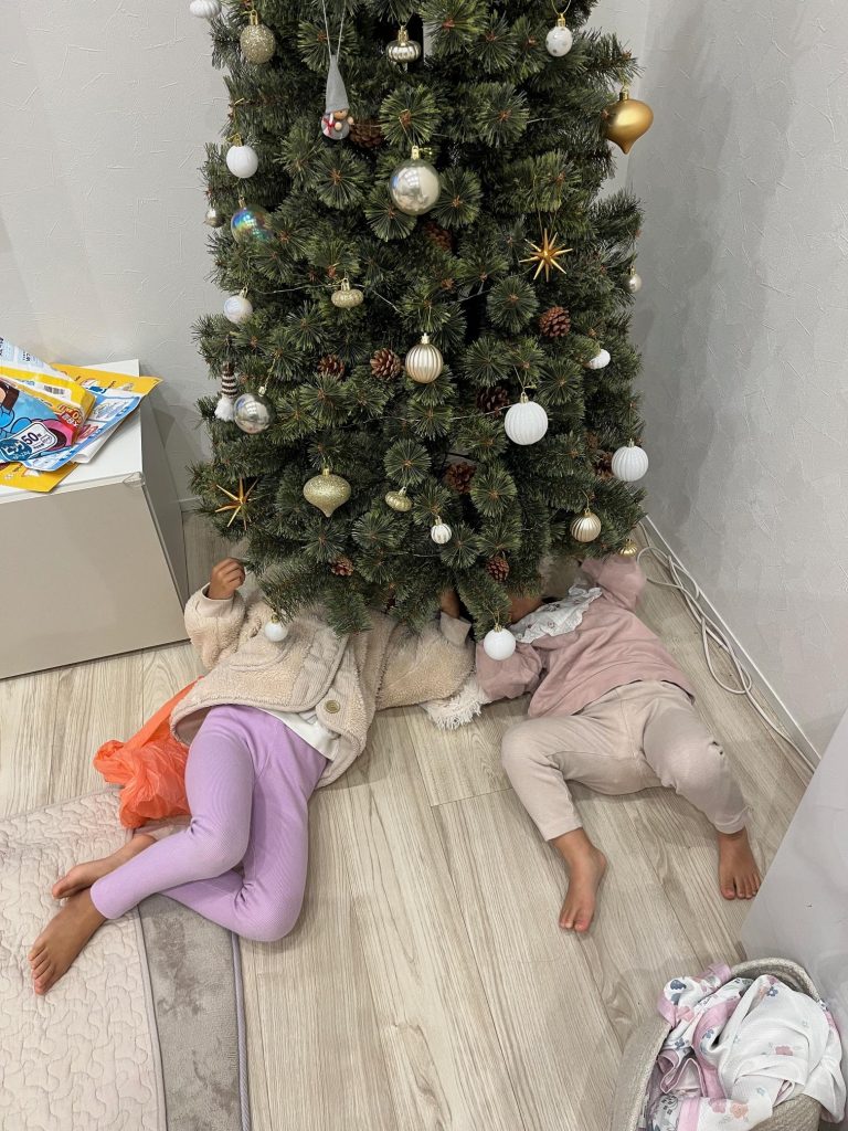 なぜかツリーの下に潜り込んで見上げるという変わった楽しみ方をしていました(`・ω・´)