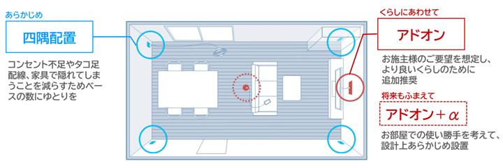 そこで今回提案されたのが「四隅配置」プラス今後の使い勝手を考えた予備「アドオン」。