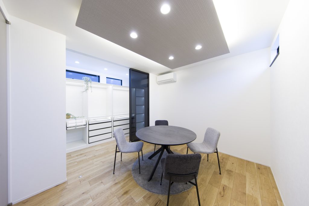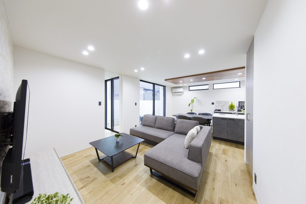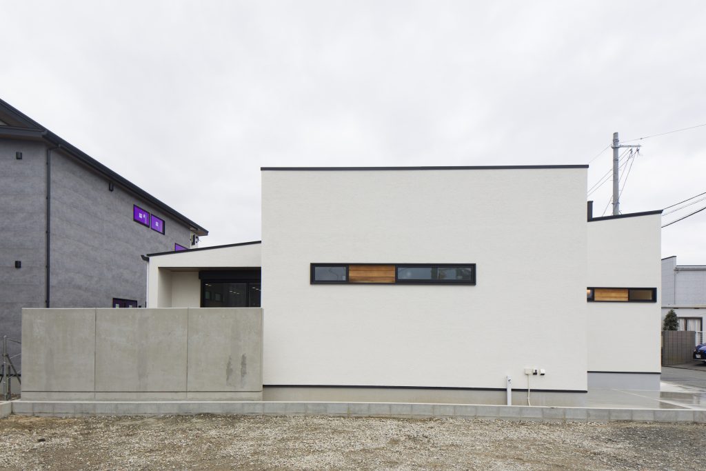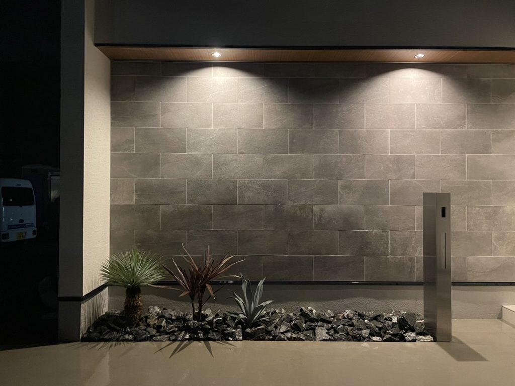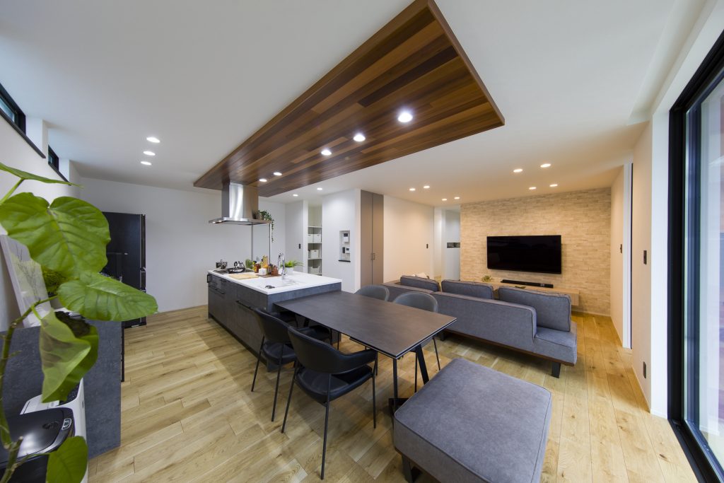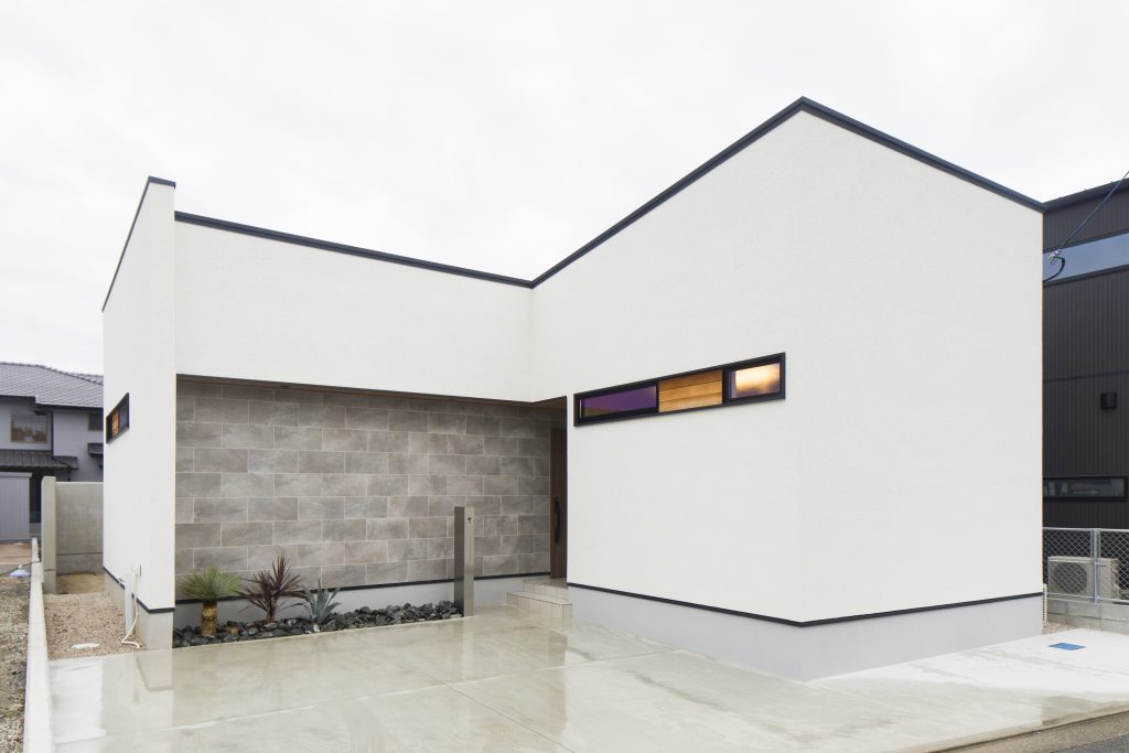 プライベートテラスのある平屋 優しさの中に力強さを感じることが出来る外観デザイン。コンクリートで目隠し壁を設けることによって落ち着いてカフェタイムを楽しんだり、ホームパーティーの際も周りの目線を気にせずに活用できるデッキ空間も魅力的。間接照明やアクセント天井により高級感を演出しながら、セカンドリビングにも活用できそうな広々居室など贅沢な空間活用を意識した建物です。