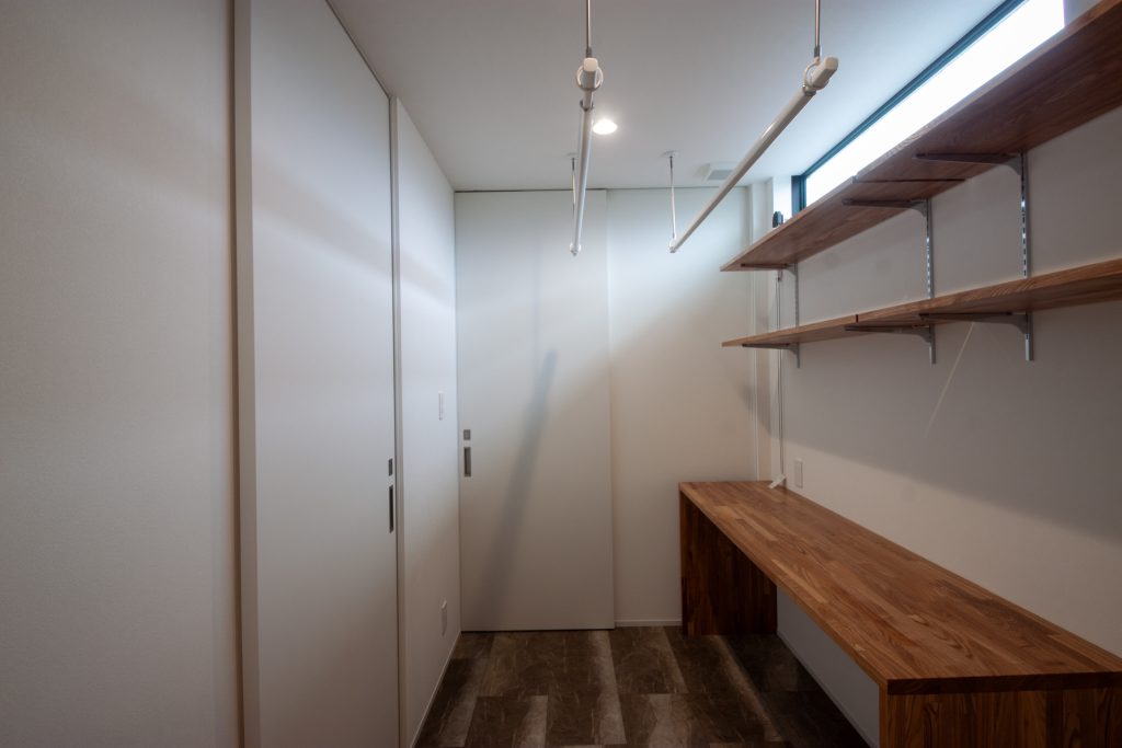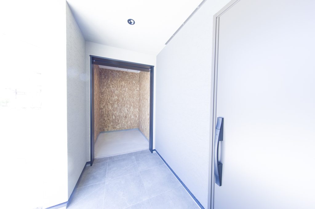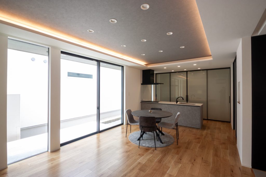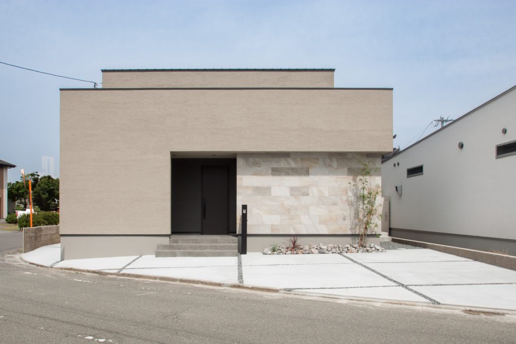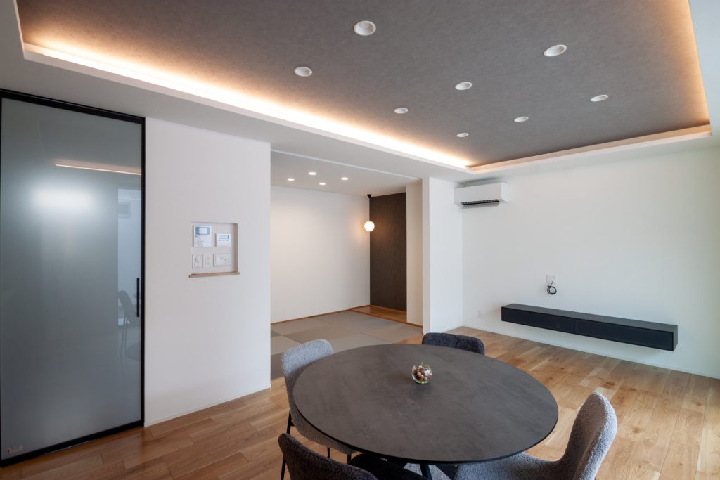 タイル×塗り壁×外部収納の家 タイルと塗り壁を張り分けることによって高級感のある外観に。外部収納を設けることでアウトドア趣味の方や自転車・バイク収納など様々な用途に活用できます。LDK周辺には客間にも活用できる畳敷の空間や、キッチン背面にパントリーと食器棚兼用の全面収納など「あったらイイな!」の空間も多数完備。間接照明を取り入れることによっても高級感を演出できました。